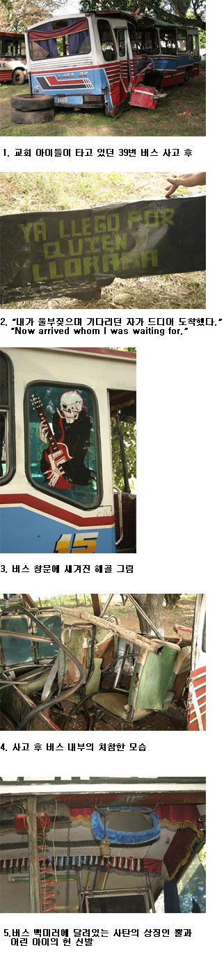 주일학교 어린이를 태우고 사고가 난 39번 버스 운전석 앞 백미러에 사탄 상징의 뿔이 달려있고 그 뿔에 어린아이의 헌 샌들이 매달려 있었습니다.